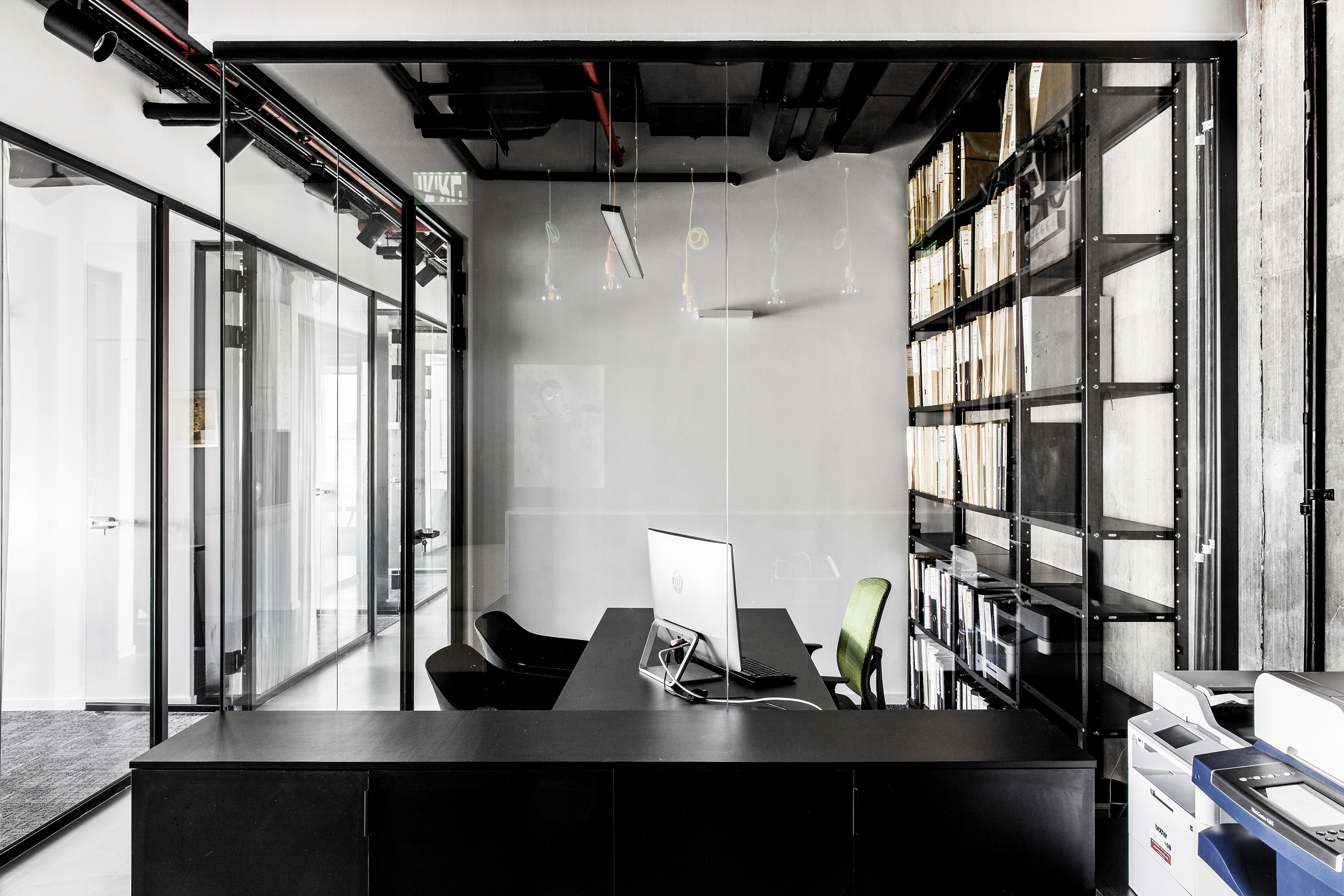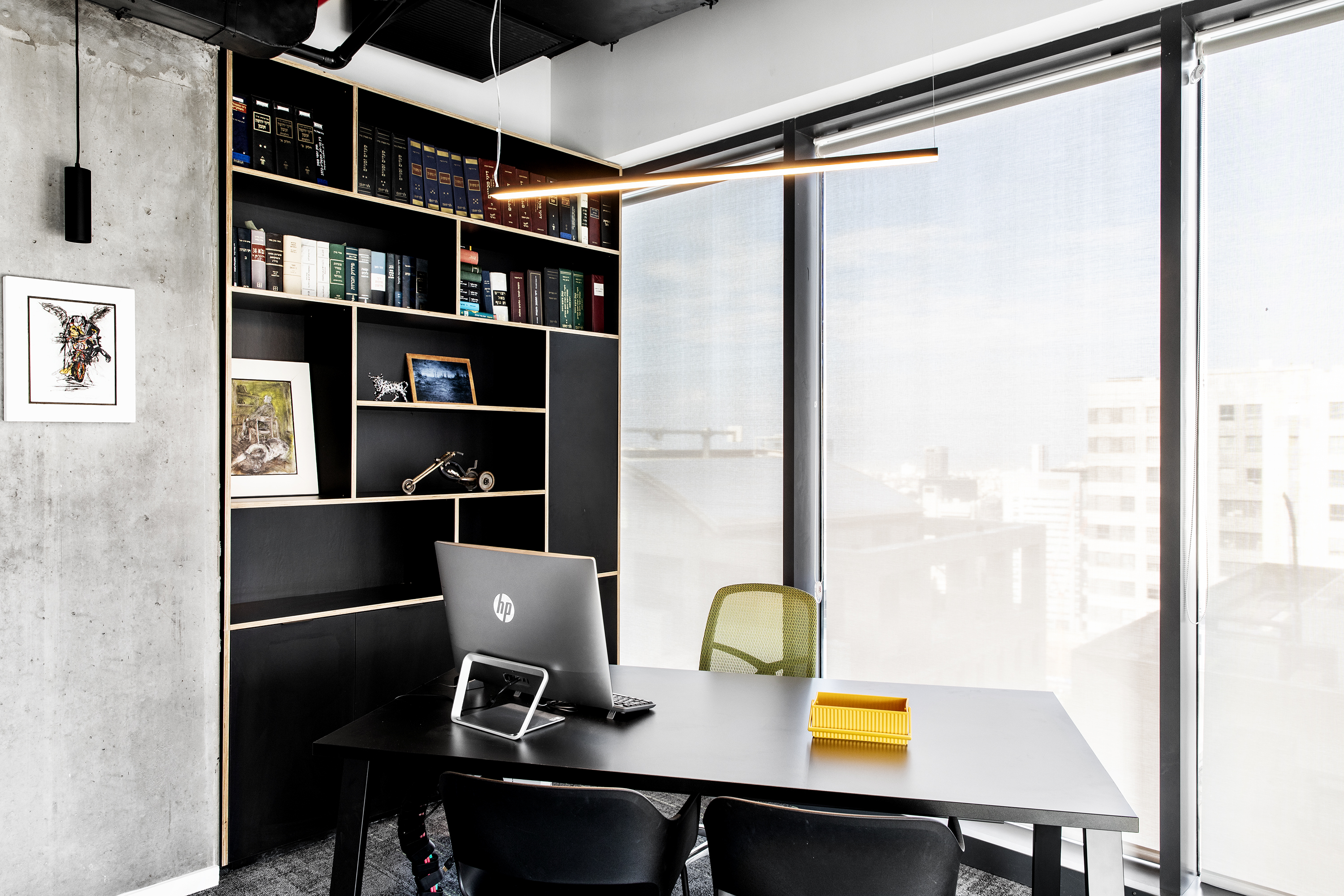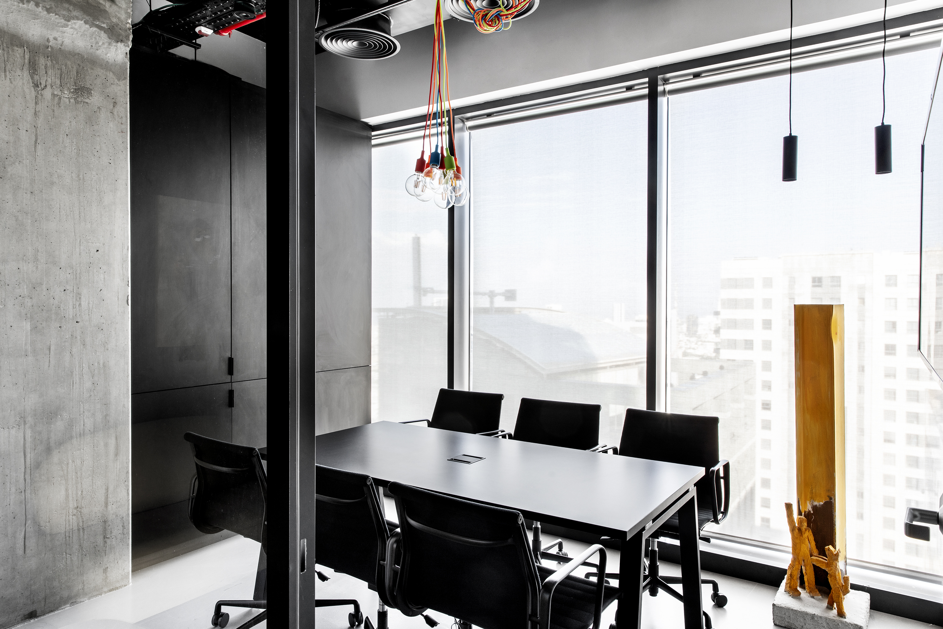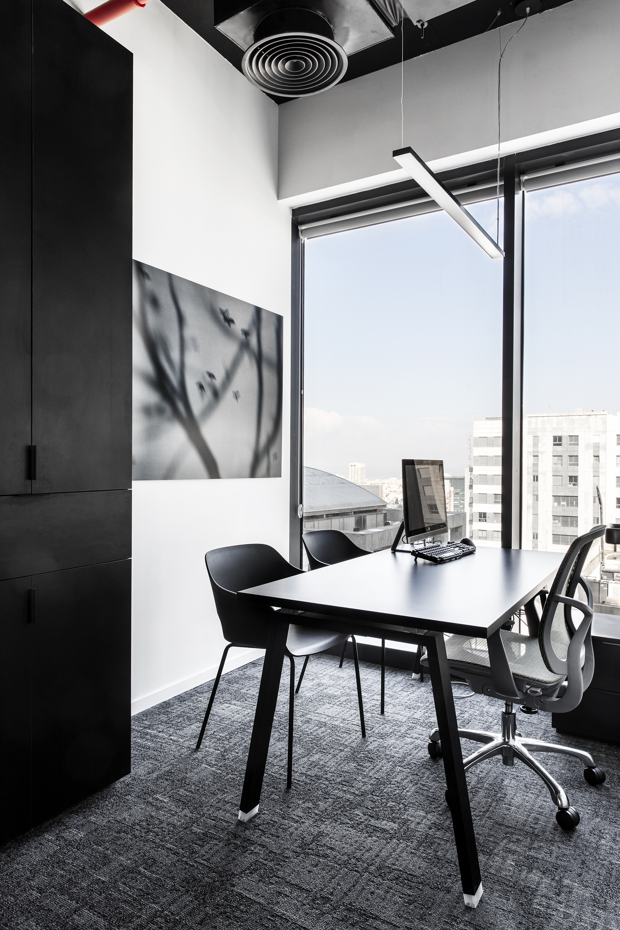 Planning and designing a quarter of an office building floor in a tower in Tel Aviv. The space was divided according to the client’s specification to contain offices for sub-renters, a common meeting room, bathroom and kitchenette. The design concept chosen for the project is industrial and formal, including ceilings with exposed electrical, telephone/internet and A.C. systems. The lines themselves are clear and clean. The color scheme is uniform – black, grey, green and yellow – and is complemented by the office owner’s artworks, which are integrated within the space.