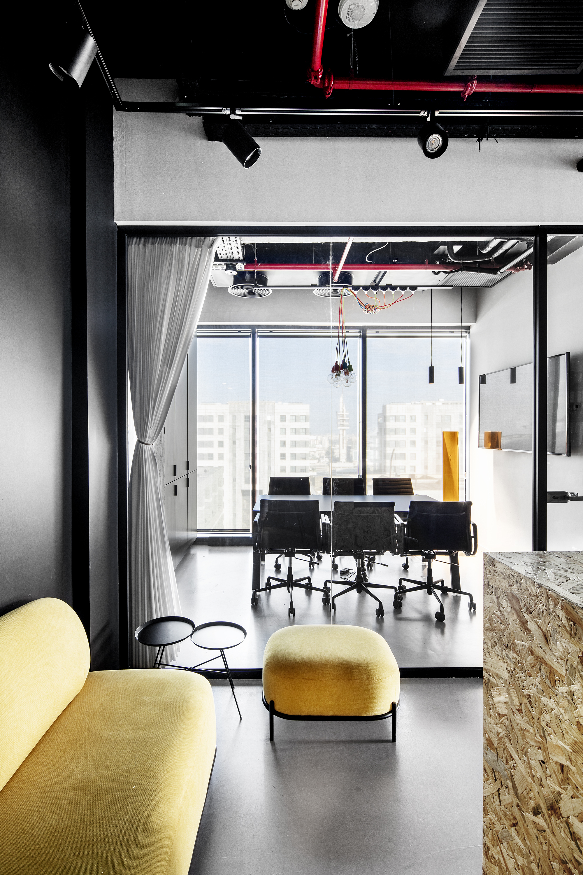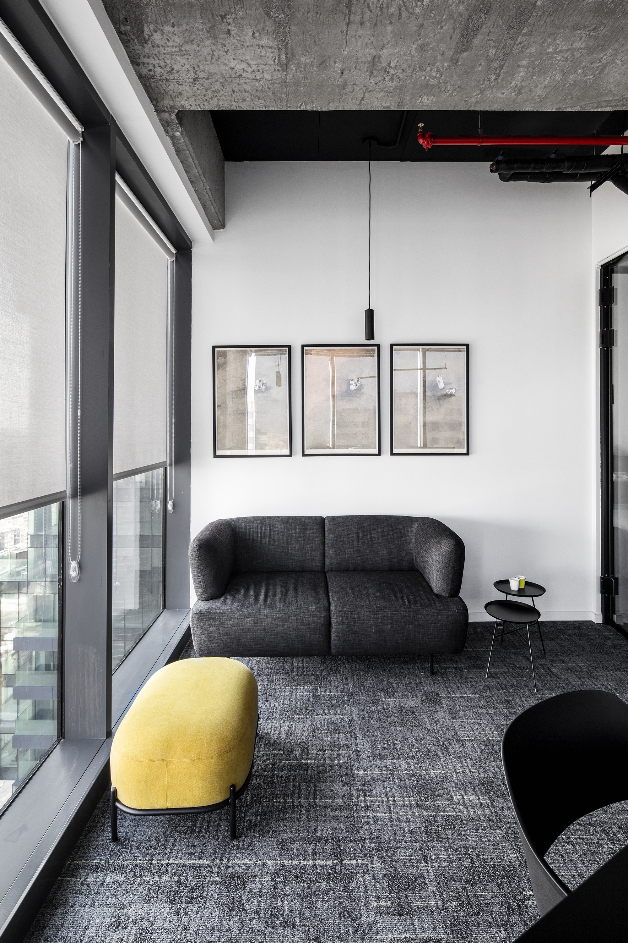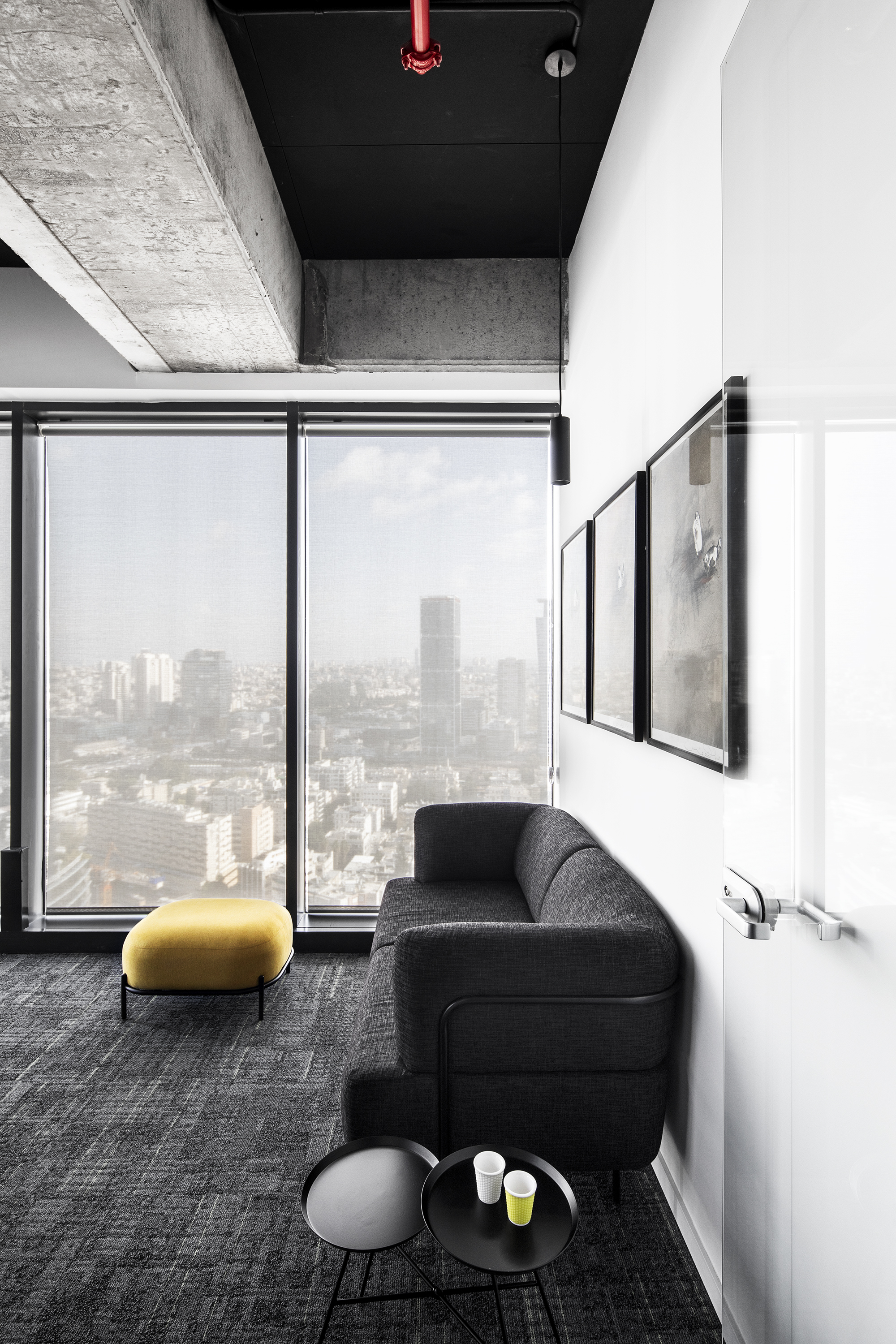 Planning and designing a quarter of an office building floor in a tower in Tel Aviv. The space was divided according to the client’s specification to contain offices for sub-renters, a common meeting room, bathroom and kitchenette. The design concept chosen for the project is industrial and formal, including ceilings with exposed electrical, telephone/internet and A.C. systems. The lines themselves are clear and clean. The color scheme is uniform – black, grey, green and yellow – and is complemented by the office owner’s artworks, which are integrated within the space.