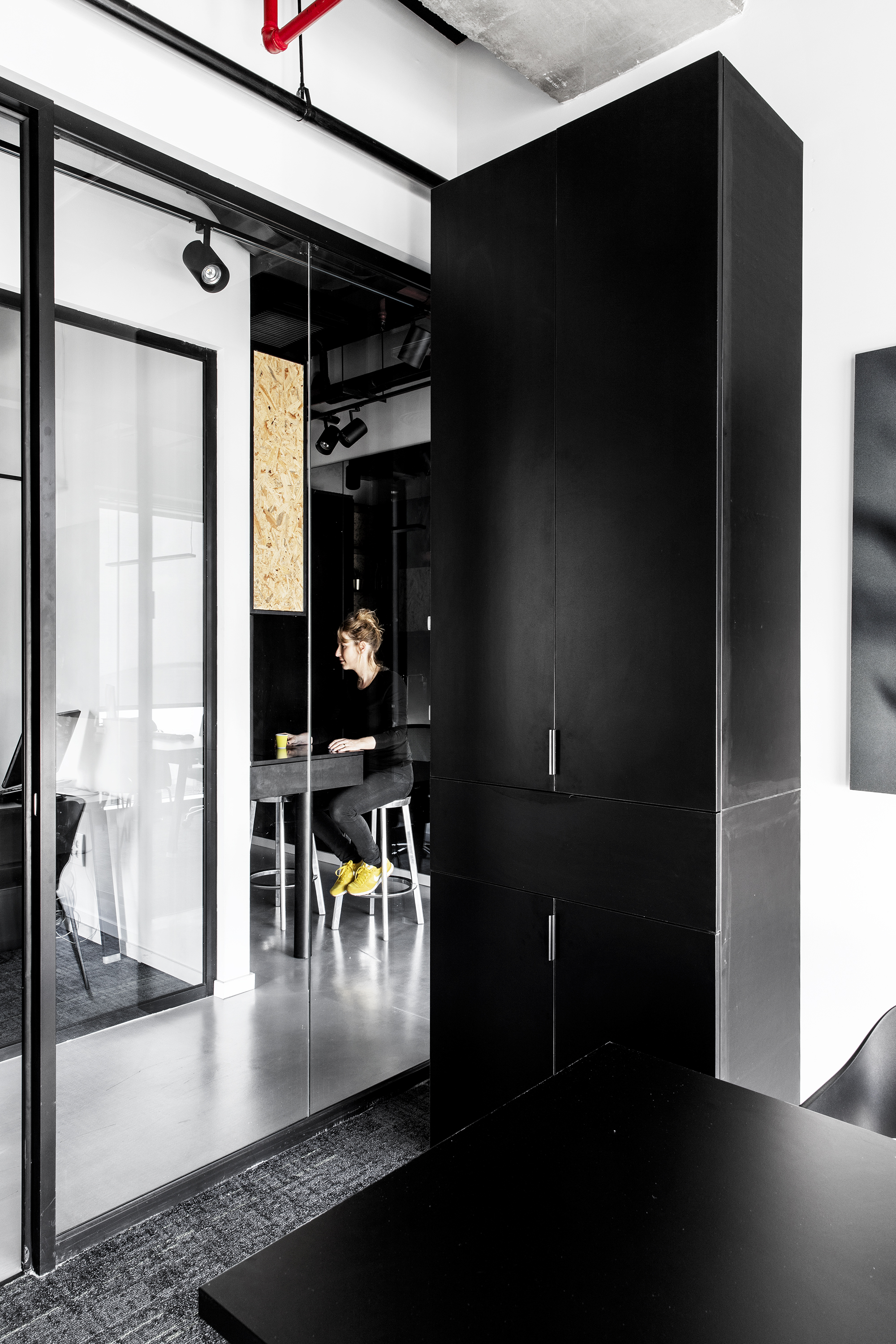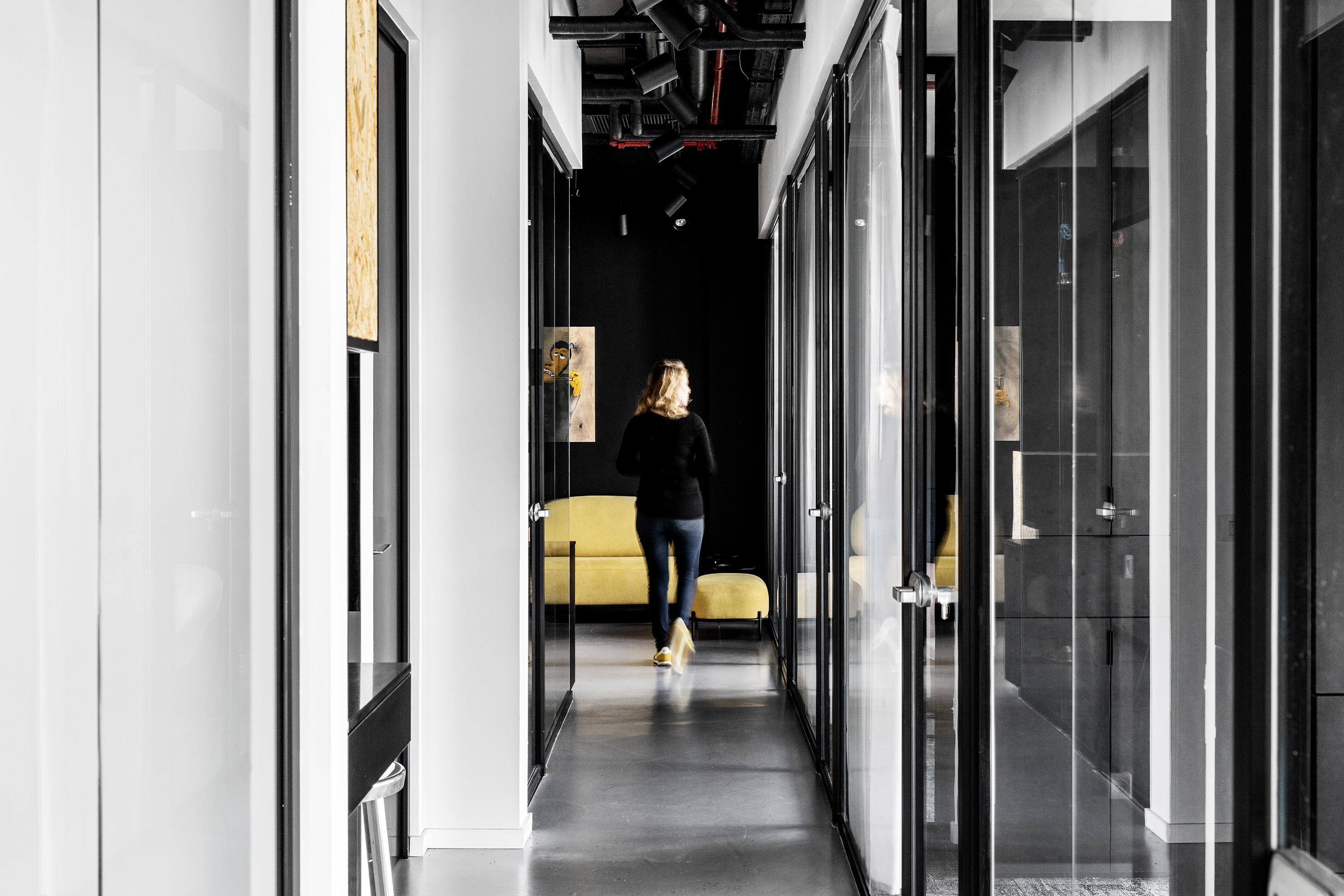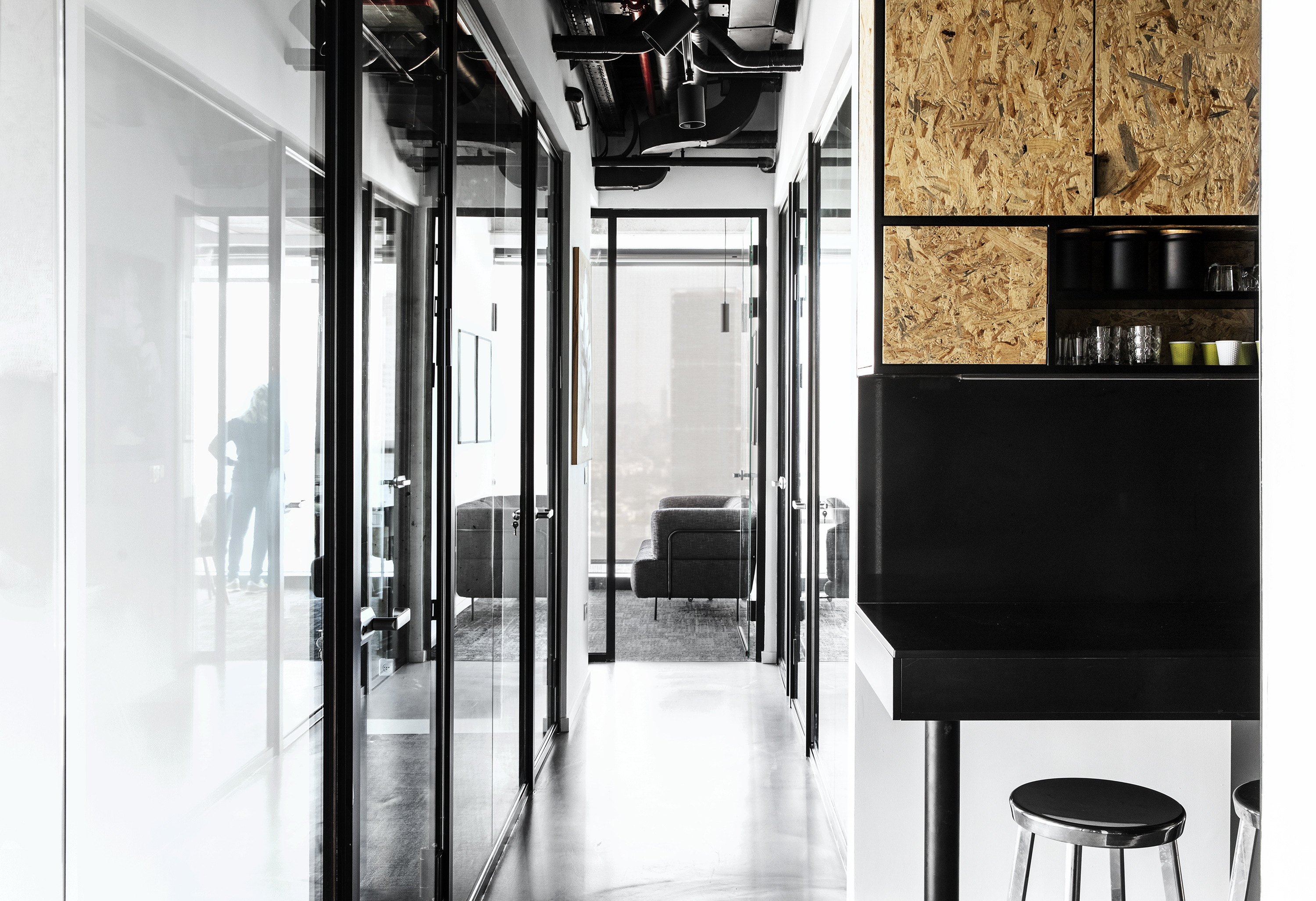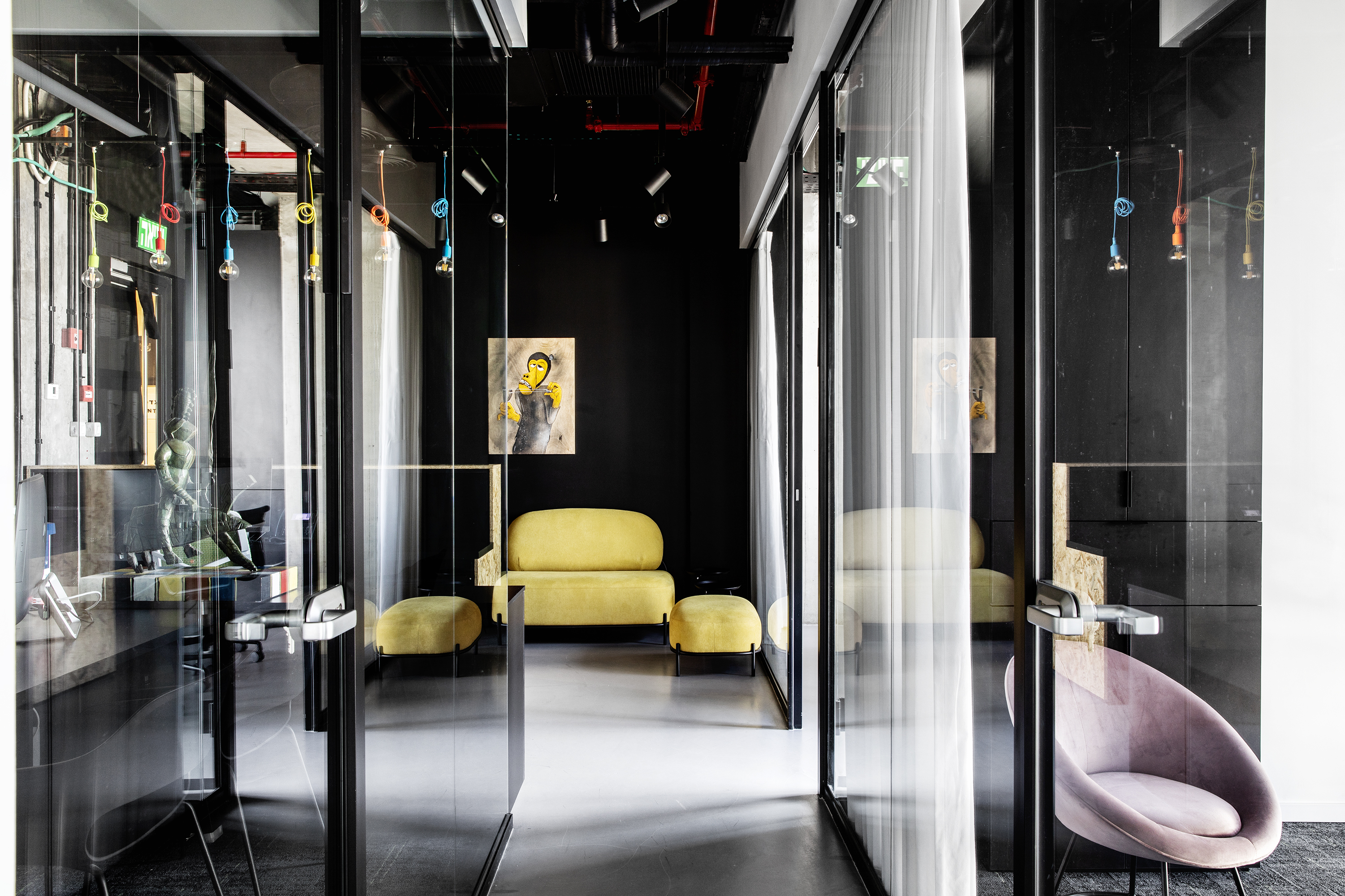 Planning and designing a quarter of an office building floor in a tower in Tel Aviv. The space was divided according to the client’s specification to contain offices for sub-renters, a common meeting room, bathroom and kitchenette. The design concept chosen for the project is industrial and formal, including ceilings with exposed electrical, telephone/internet and A.C. systems. The lines themselves are clear and clean. The color scheme is uniform – black, grey, green and yellow – and is complemented by the office owner’s artworks, which are integrated within the space.