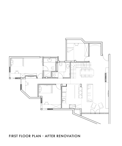 A double-floor four-room penthouse that was turned into five rooms to allow separate rooms for each child and an intimate, private parent unit. The old, claustrophobic roof-top storage room was enlarged and designed as a pleasant 40 m2 parent unit aside of which runs an inviting passage to the roof, where guests are hosted. The lower floor was renewed, and the living room redesigned. Each child now has a private room adapted to their needs and in addition a work and play space for the children. The work involved different carpentry features designed according to considerations of storage, everyday use and aesthetics.