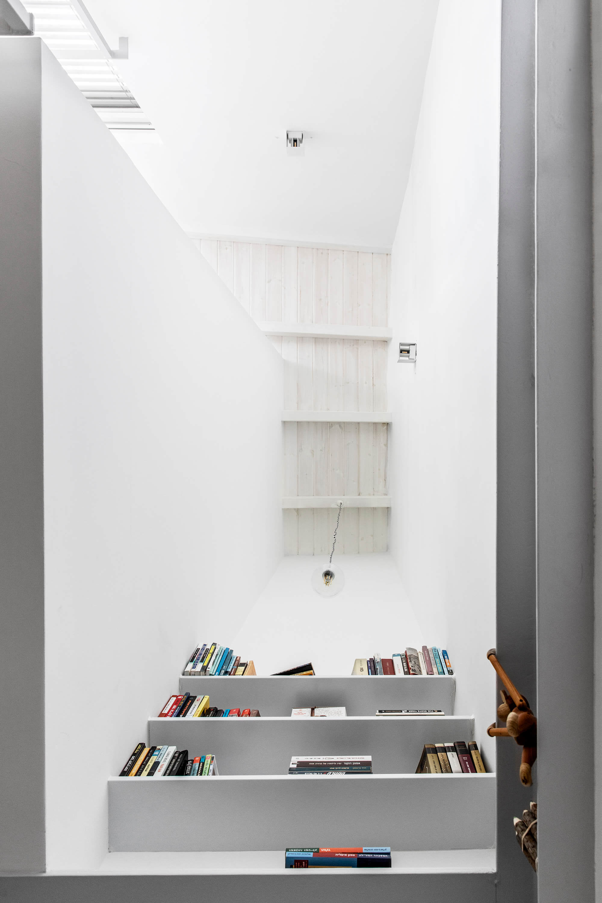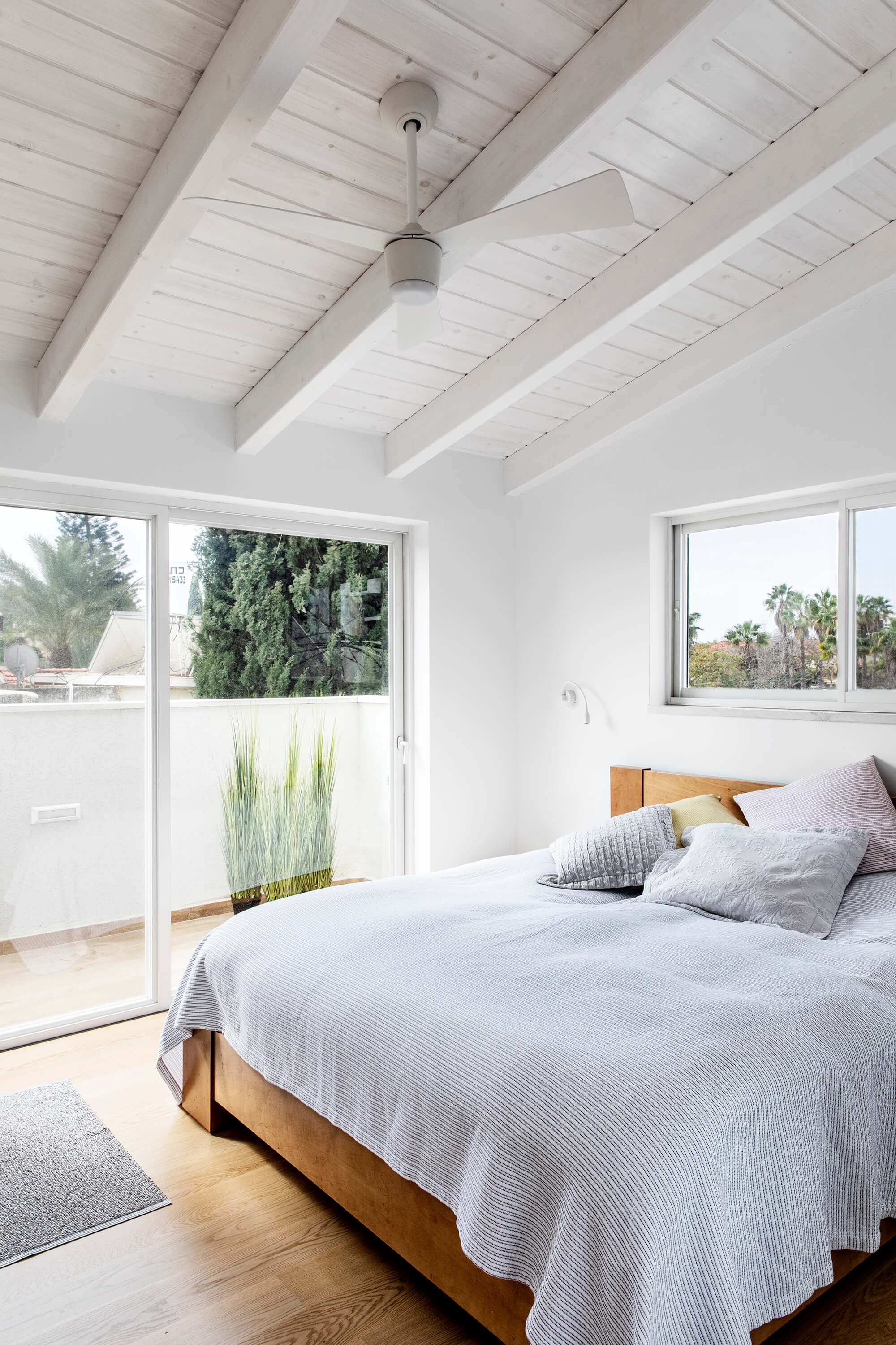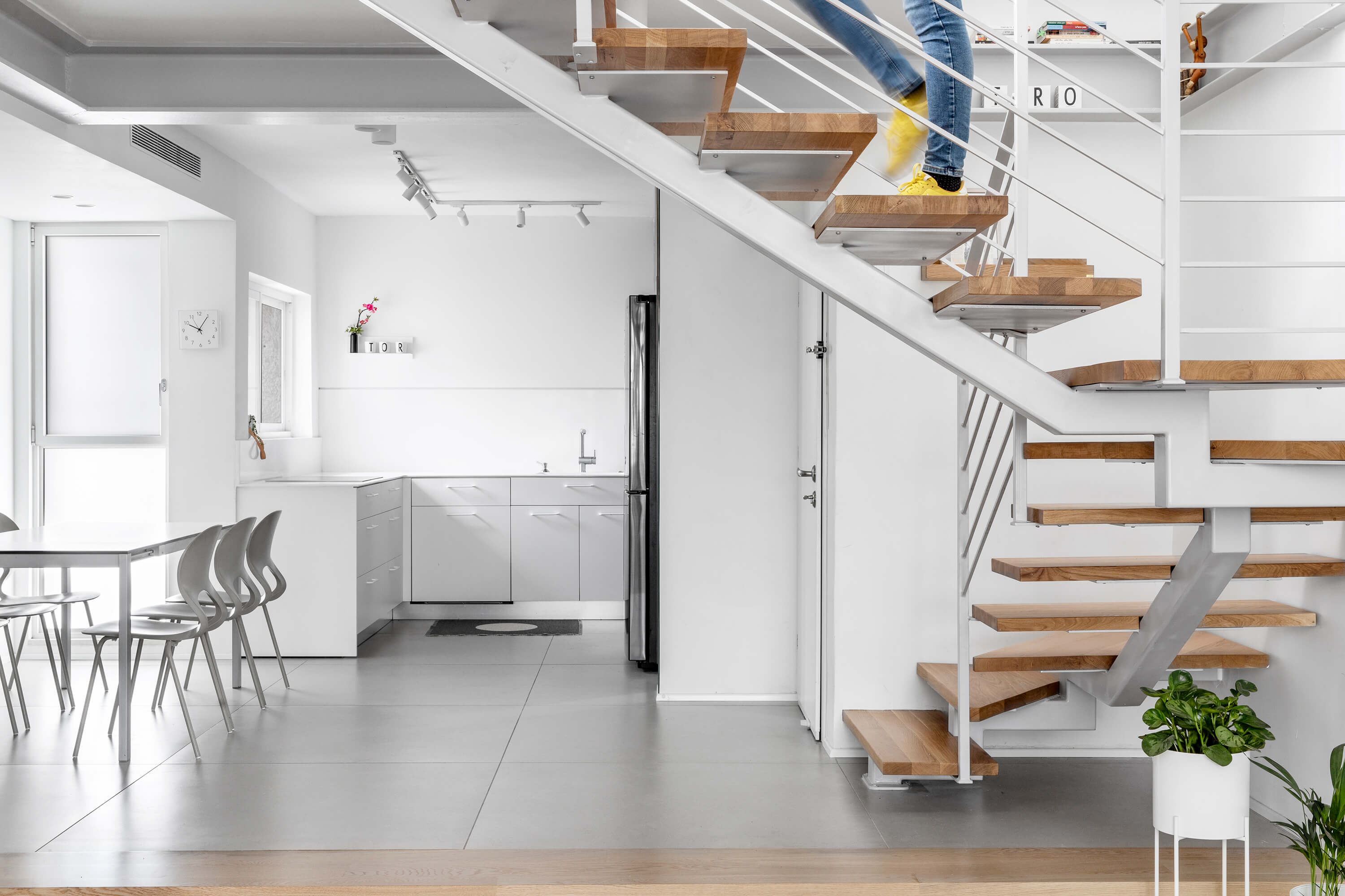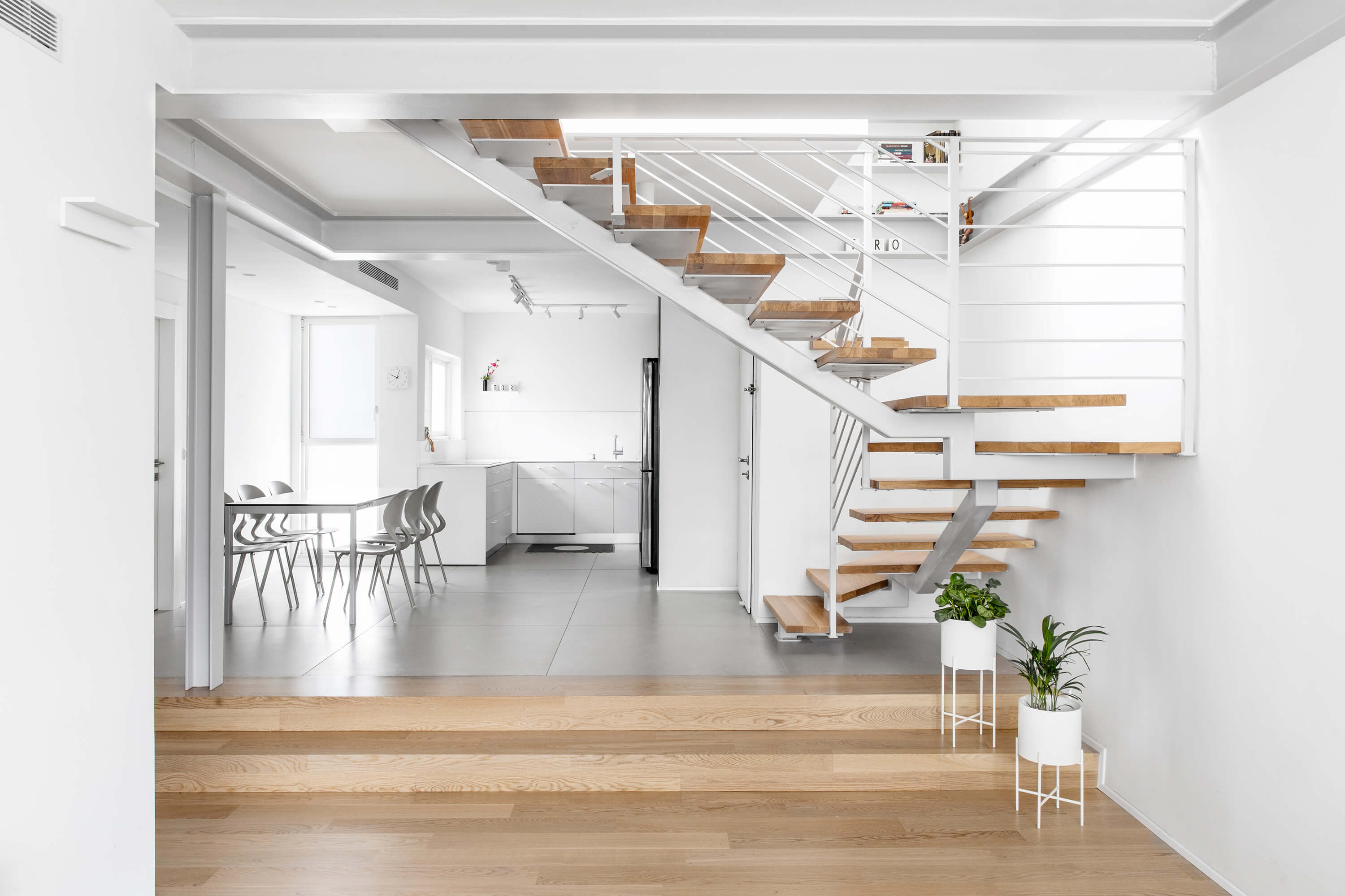 דירת גג של ארבעה חדרים, שנרכשה לפני עשר שנים והתאימה בשעתו לדרישות המשפחה. מאז התבגרו הילדים, וגם העדפותיהם של ההורים השתנו. לאור זאת עוצבה הדירה מחדש בקו אירופי נקי ואל-זמני, המשלב נטייה מינימליסטית וחמימות ביתית. זכויות בנייה במפלס הגג נוצלו לשם הקמה של יחידת הורים, שלצדה נשמר אזור אירוח פתוח. לצורך זה נשמרה גם ההפרדה בין יחידת ההורים לבין היציאה אל הגג. מיקומו של גרם המדרגות בחלל המקורי יצר חסימה בין המטבח לסלון, והותיר מרחב סגור ואפלולי. במסגרת התכנון המחודש הועבר גרם המדרגות ממקומו ועוצב מחדש בקווים מינימליסטיים, בין היתר כדי לצמצם את נוכחותו הוויזואלית בחלל הבית ולחבר בין הסלון למטבח. השינוי דרש תכנון מחודש של התקרה ושילוב אלמנטים קונסטרוקטיביים בדמות קורות פלדה. אלה נצבעו באפור בהיר כדי לאזן בין המראה התעשייתי לבין תחושה של קלילות – וכל זאת, בלי להסתיר את יופיו של החומר.