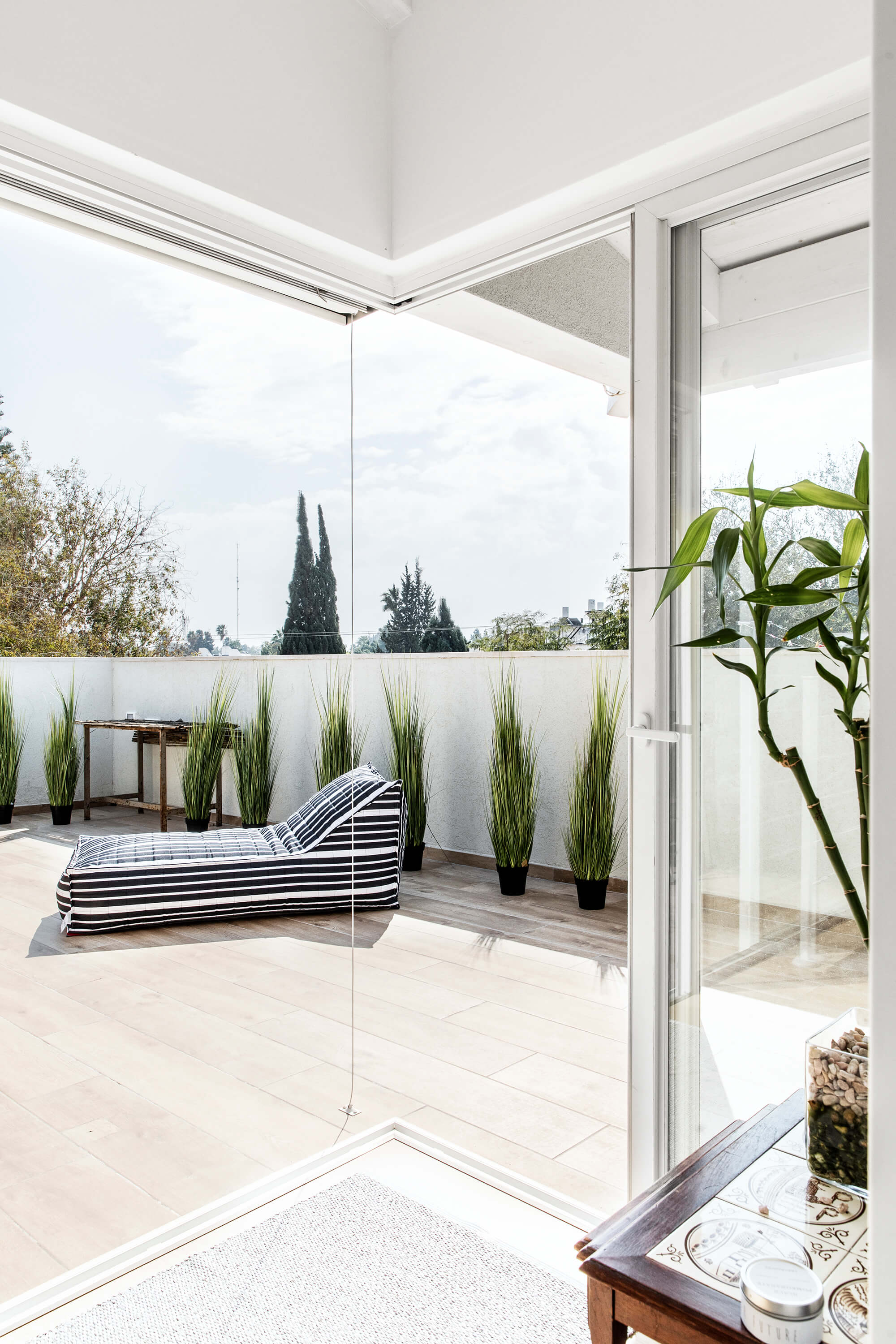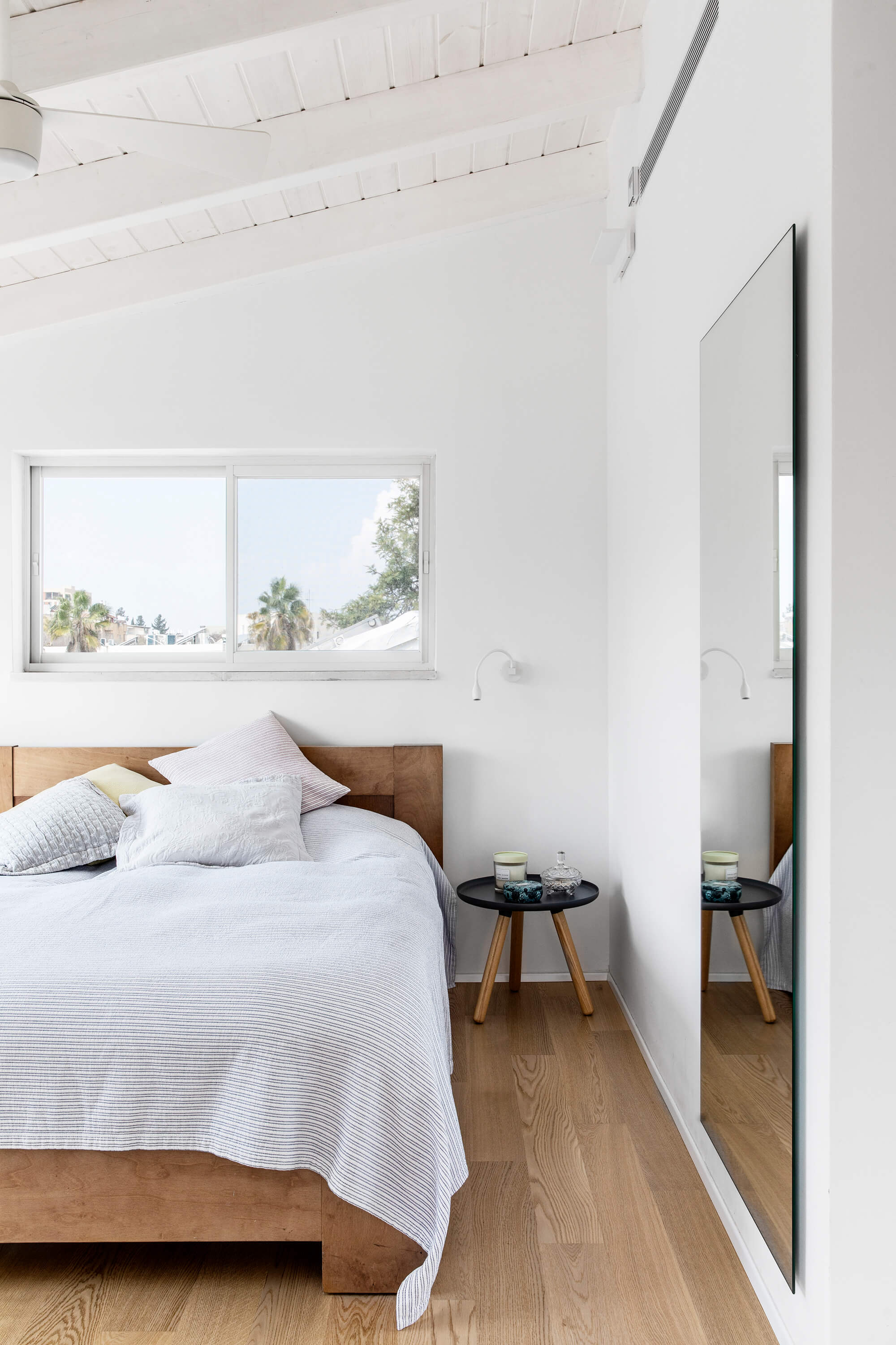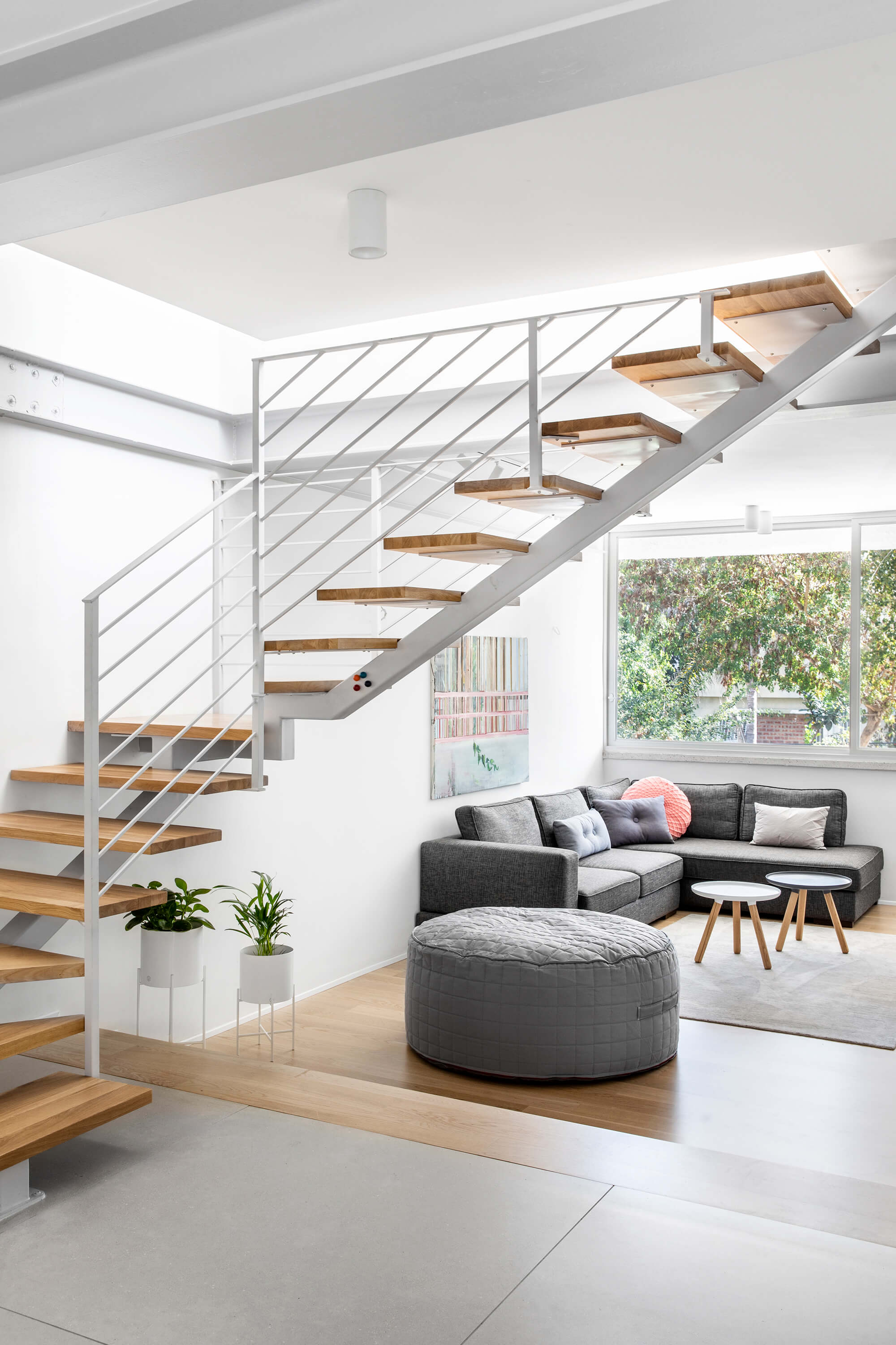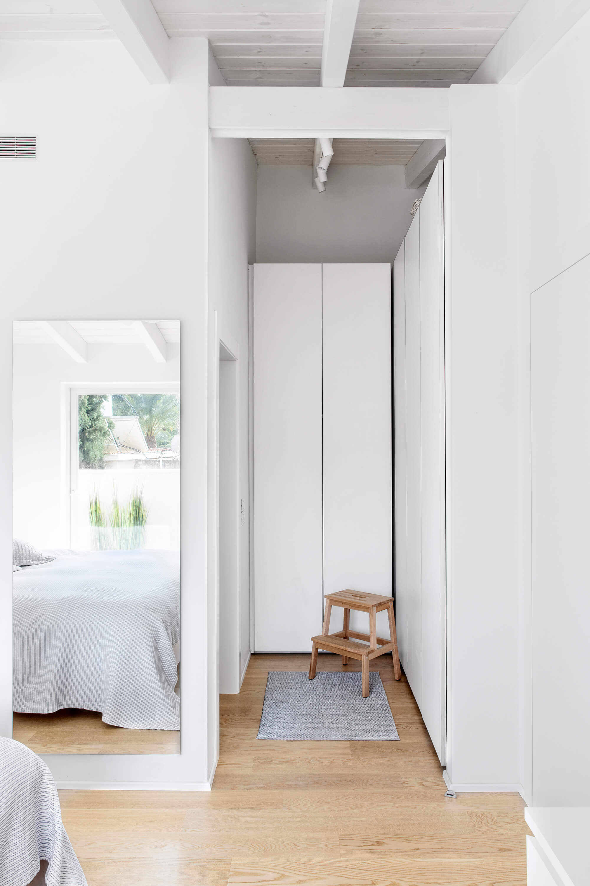 דירת גג של ארבעה חדרים, שנרכשה לפני עשר שנים והתאימה בשעתו לדרישות המשפחה. מאז התבגרו הילדים, וגם העדפותיהם של ההורים השתנו. לאור זאת עוצבה הדירה מחדש בקו אירופי נקי ואל-זמני, המשלב נטייה מינימליסטית וחמימות ביתית. זכויות בנייה במפלס הגג נוצלו לשם הקמה של יחידת הורים, שלצדה נשמר אזור אירוח פתוח. לצורך זה נשמרה גם ההפרדה בין יחידת ההורים לבין היציאה אל הגג. מיקומו של גרם המדרגות בחלל המקורי יצר חסימה בין המטבח לסלון, והותיר מרחב סגור ואפלולי. במסגרת התכנון המחודש הועבר גרם המדרגות ממקומו ועוצב מחדש בקווים מינימליסטיים, בין היתר כדי לצמצם את נוכחותו הוויזואלית בחלל הבית ולחבר בין הסלון למטבח. השינוי דרש תכנון מחודש של התקרה ושילוב אלמנטים קונסטרוקטיביים בדמות קורות פלדה. אלה נצבעו באפור בהיר כדי לאזן בין המראה התעשייתי לבין תחושה של קלילות – וכל זאת, בלי להסתיר את יופיו של החומר.