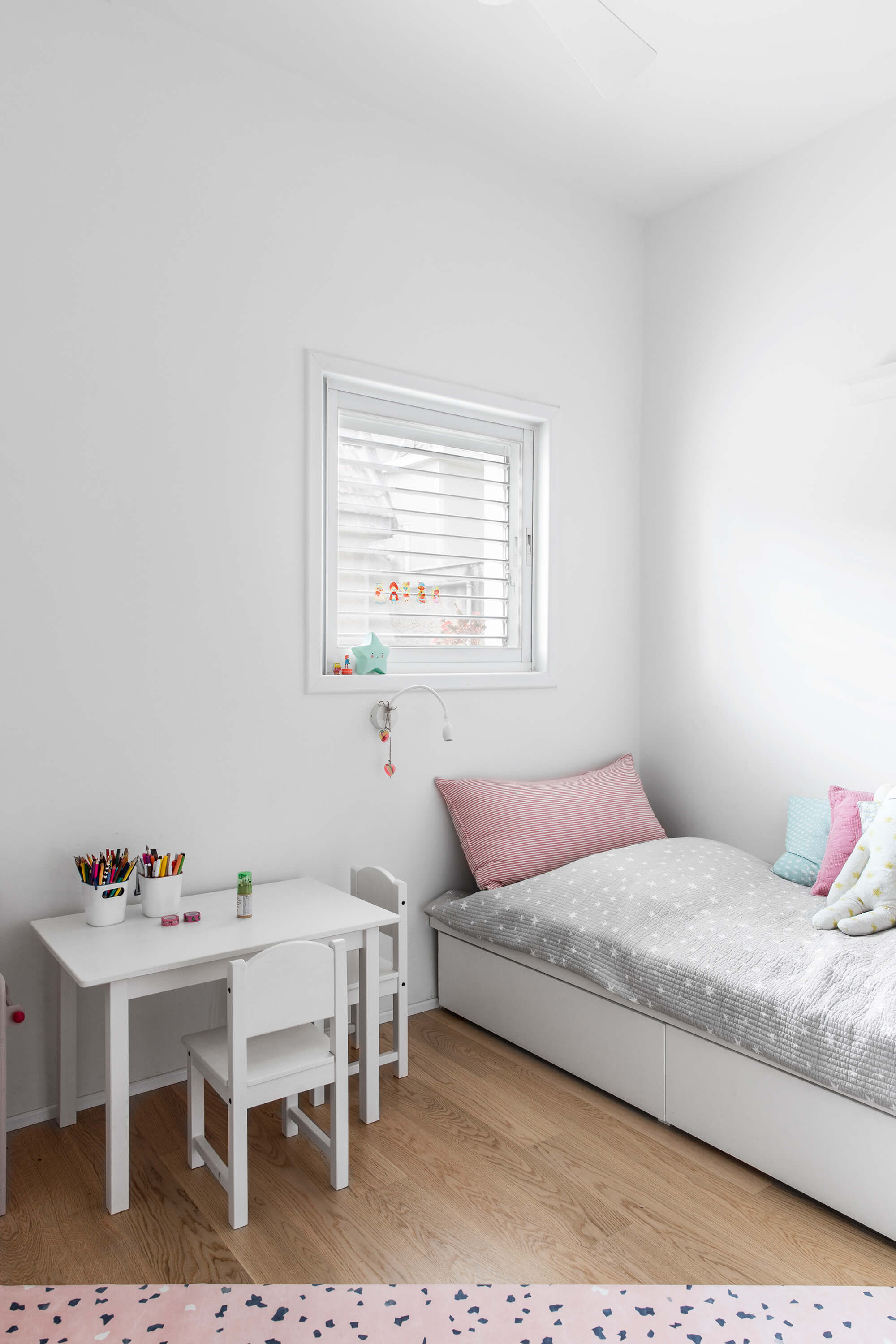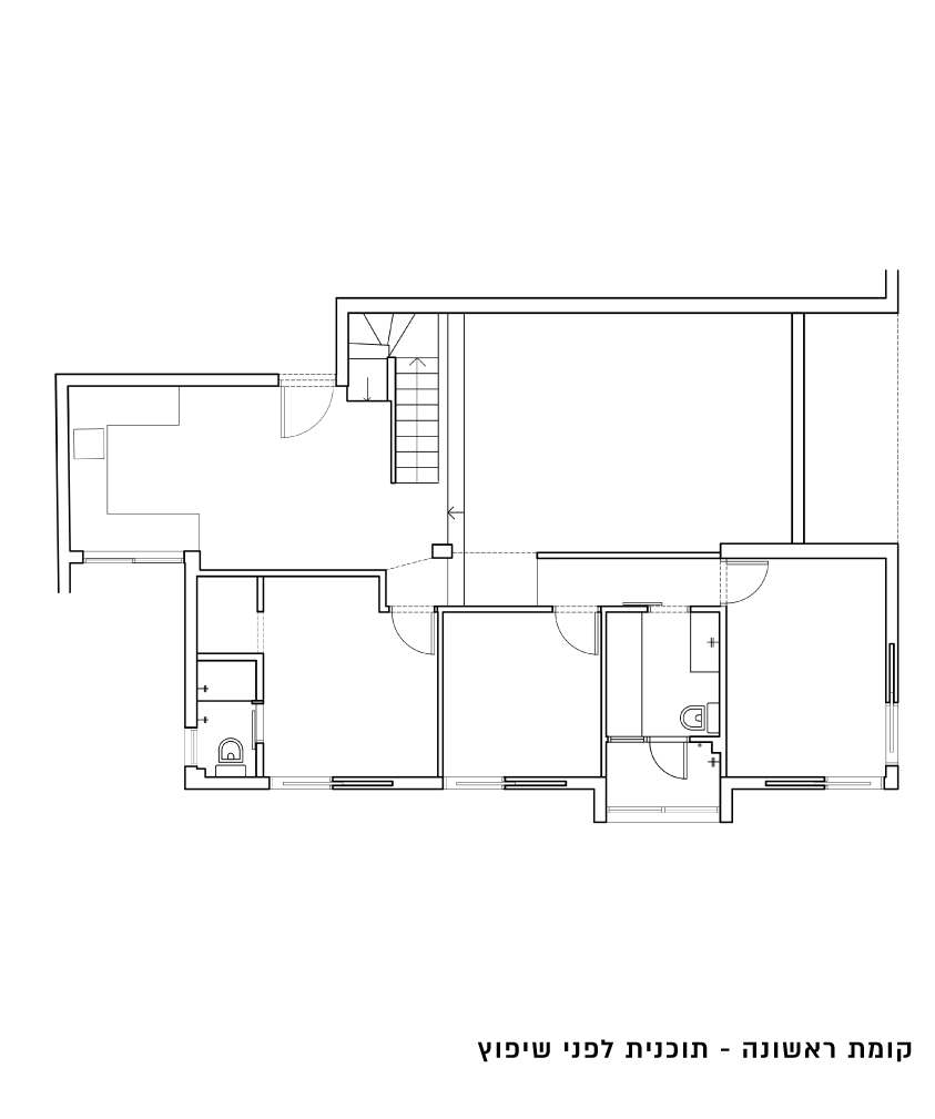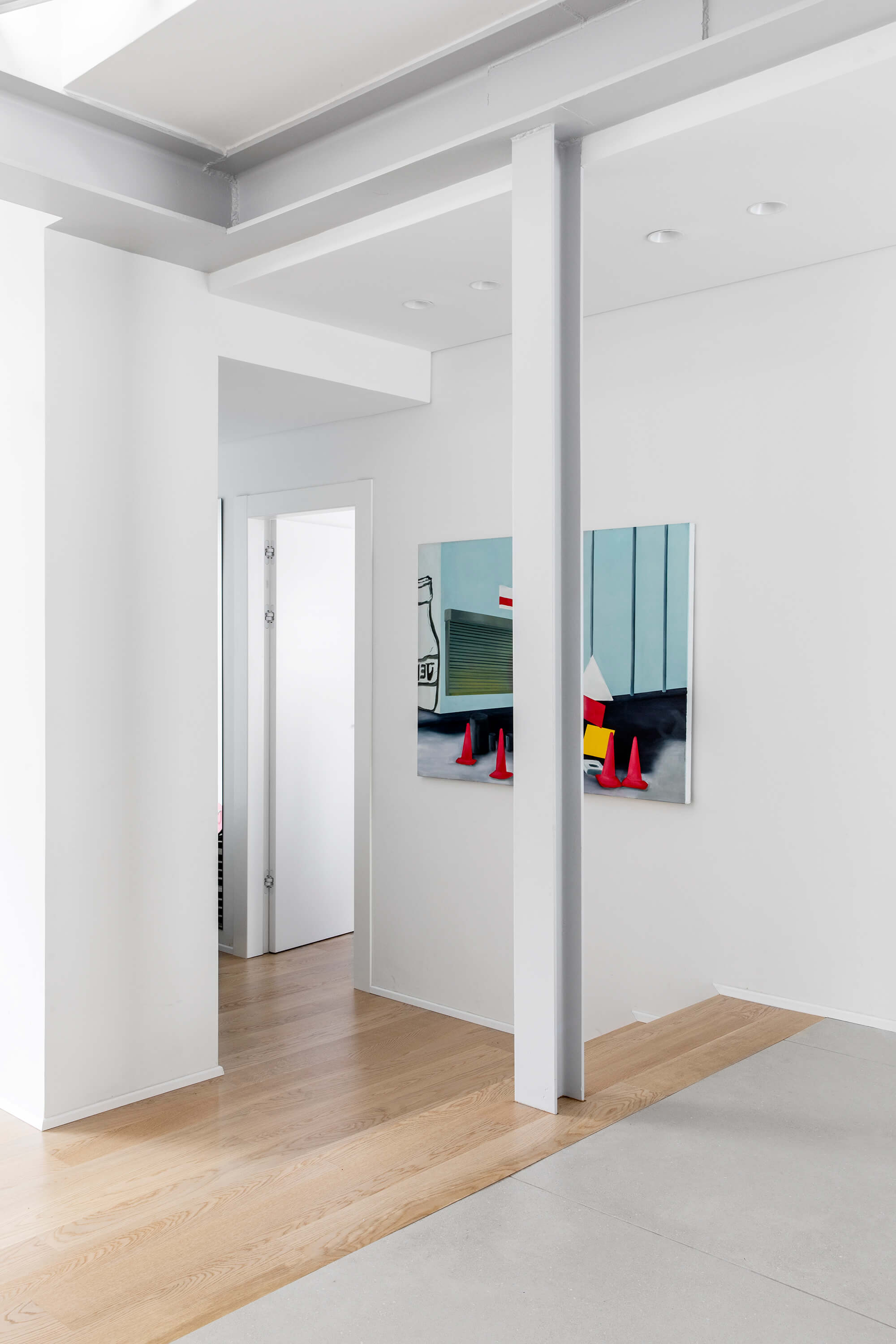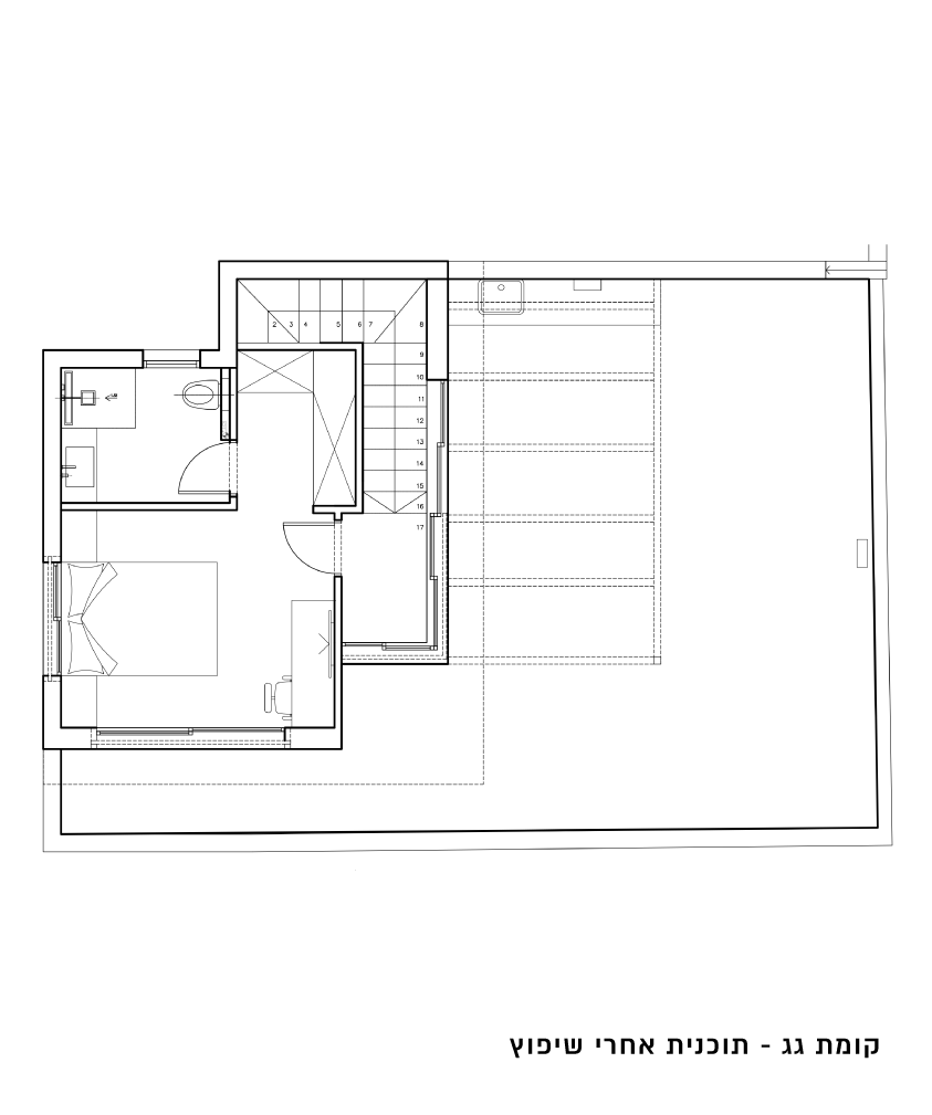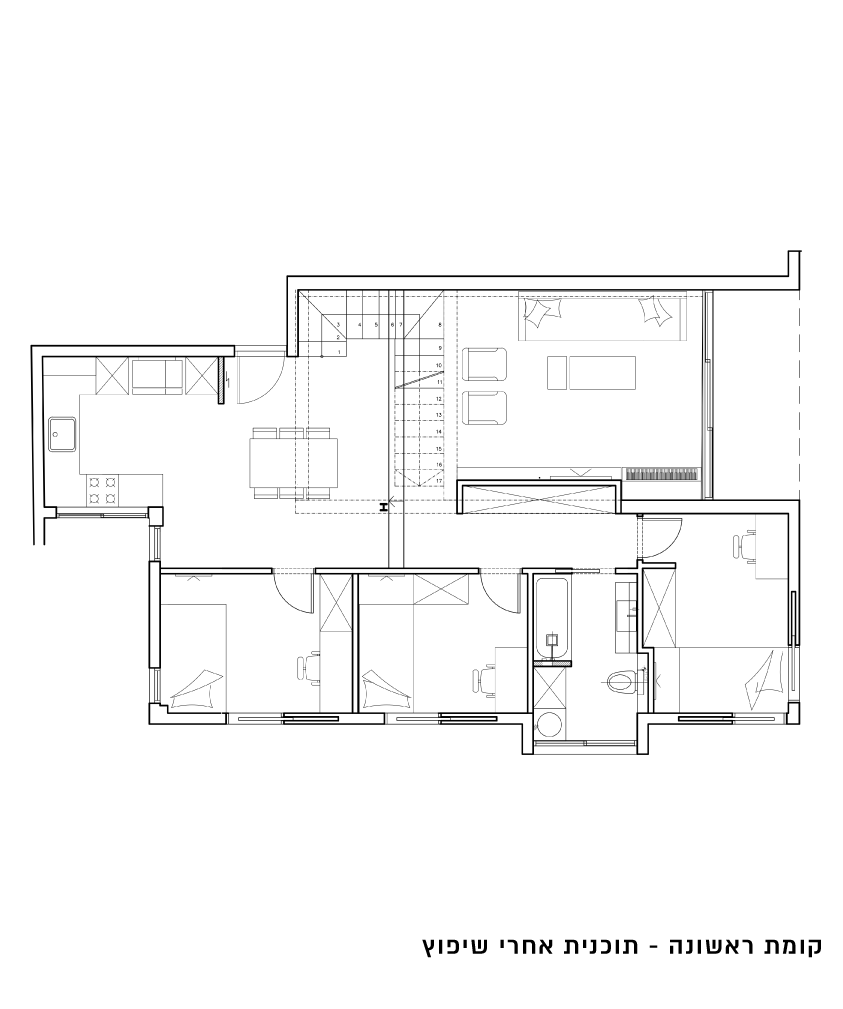 דירת גג של ארבעה חדרים, שנרכשה לפני עשר שנים והתאימה בשעתו לדרישות המשפחה. מאז התבגרו הילדים, וגם העדפותיהם של ההורים השתנו. לאור זאת עוצבה הדירה מחדש בקו אירופי נקי ואל-זמני, המשלב נטייה מינימליסטית וחמימות ביתית. זכויות בנייה במפלס הגג נוצלו לשם הקמה של יחידת הורים, שלצדה נשמר אזור אירוח פתוח. לצורך זה נשמרה גם ההפרדה בין יחידת ההורים לבין היציאה אל הגג. מיקומו של גרם המדרגות בחלל המקורי יצר חסימה בין המטבח לסלון, והותיר מרחב סגור ואפלולי. במסגרת התכנון המחודש הועבר גרם המדרגות ממקומו ועוצב מחדש בקווים מינימליסטיים, בין היתר כדי לצמצם את נוכחותו הוויזואלית בחלל הבית ולחבר בין הסלון למטבח. השינוי דרש תכנון מחודש של התקרה ושילוב אלמנטים קונסטרוקטיביים בדמות קורות פלדה. אלה נצבעו באפור בהיר כדי לאזן בין המראה התעשייתי לבין תחושה של קלילות – וכל זאת, בלי להסתיר את יופיו של החומר.