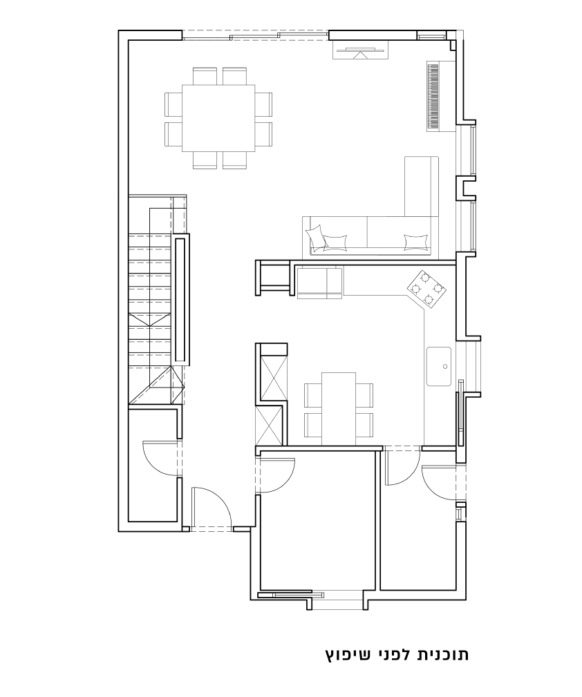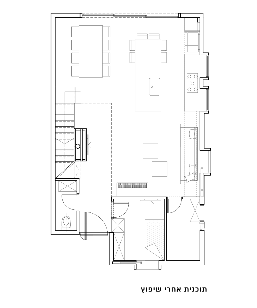 שיפוץ רחב ההיקף בבית פרטי בשכונת אפקה היוקרתית בתל אביב. במסגרת השיפוץ תוכננה ועוצבה מחדש בהתאם לצרכי הלקוח קומת הכניסה. בעלת הבית אוהבת לבשל ולארח ורצתה להפוך את הקומה לחלל מיוחד מזמין ומארח. המטבח הפך להיות לליבת הבית, הוגדל וחובר לפינת האוכל. מבואת הכניסה חוברה אל החלל החדש, המהווה כעת חלל שירות לכלל הבית. הסלון הוגדר מחדש כיחידה עיצובית בעלת שימוש דואלי פרטית וציבורית.